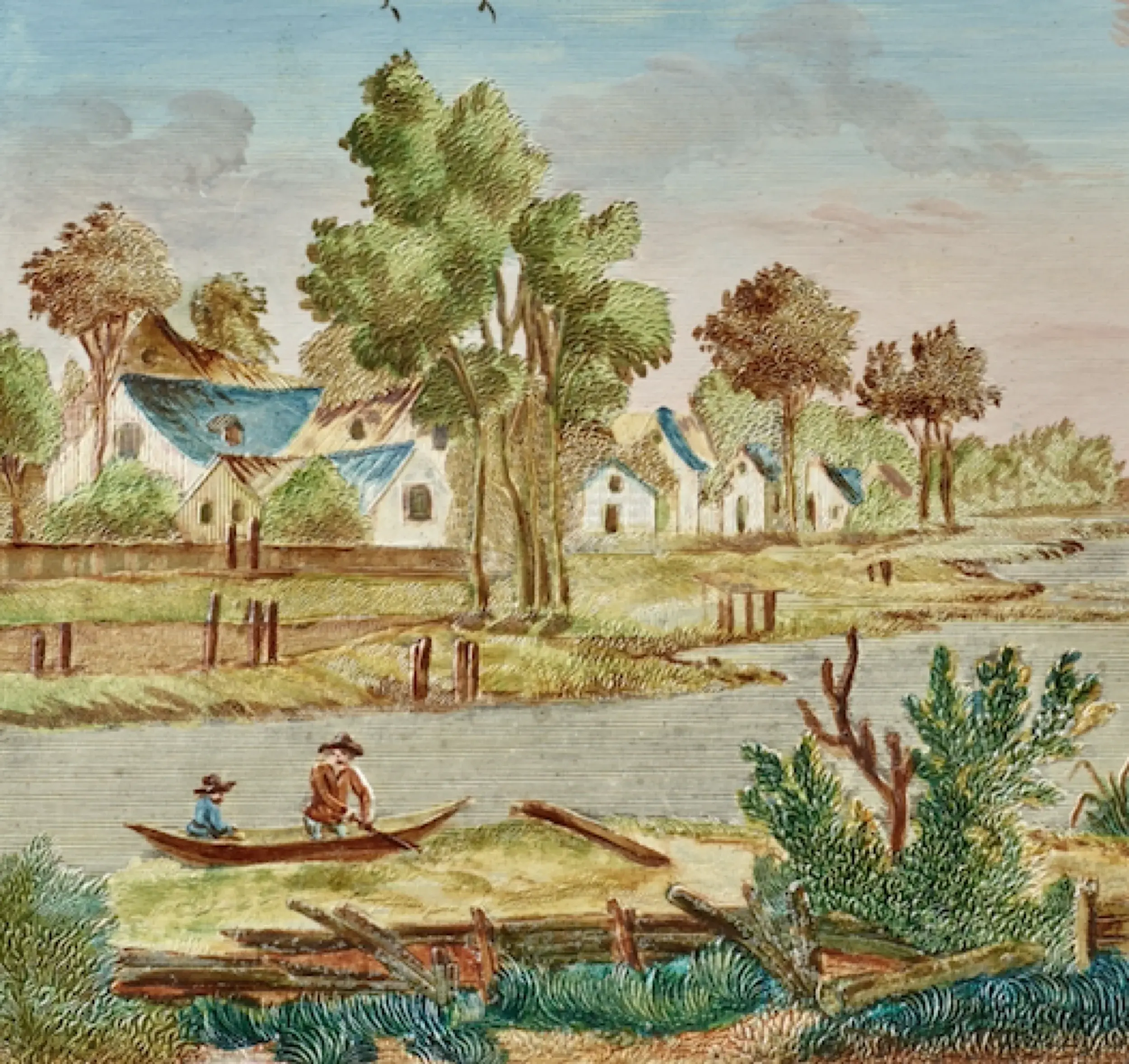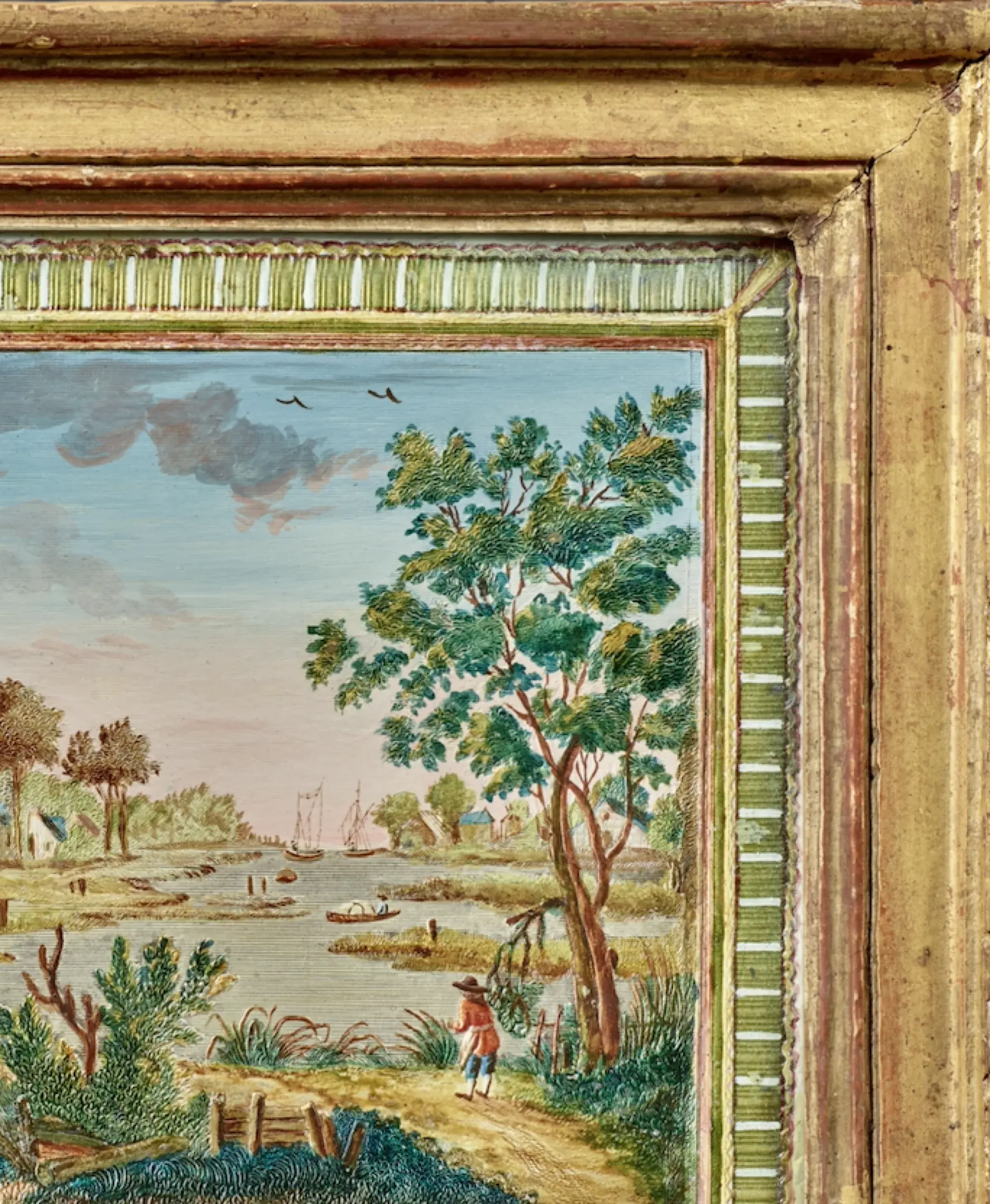 This painting in Compigné represents a riverside landscape, animated with characters sailing on the water. The whole is decorated with a frame ornamented with gold borders. Of modest size and rectangular shape, it is made in stamped pewter leaf. The latter is enhanced with silver, gold leaf and gouache, which intense colors contrast with the pewter. This skillful mixture of materials produces an effect of perfect symbiosis between the painting and the engraving. In the foreground, the scene represents the sinuous bank of a river, where a first character, standing from behind, observes the watercourse, which stretches to the background. The horizontal lines in silver tones used to represent the river give the impression of flat and peaceful water. Two men are busy docking their boat. A similar boat is tipped over on its side, between the branches of the land. A hamlet can be seen further down the shore, in the distance. Two sailboats are passing by, as well as a fisherman. On the opposite bank, another hamlet, similar to the first, appears through the greenery. The latter is sparse but enhanced by bright colors. The intense green of the foliage is merging with lighter shades, bringing a delicate relief and shimmer to the composition. The orange-pink hues of the trees surrounding the second hamlet harmonize perfectly with the colors of the calm end-of-the-day sky, which harmoniously fades from pink to the deep gray of the few clouds and birds flying over the composition.