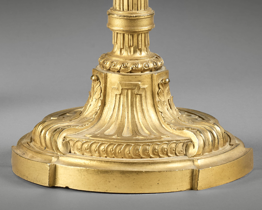 La base circulaire de cette paire de flambeau en bronze doré et ciselé alterne trois cannelures dans un encadrement en forme de trapèze et trois feuilles d’acanthes soulignées par une frise de piastres.
