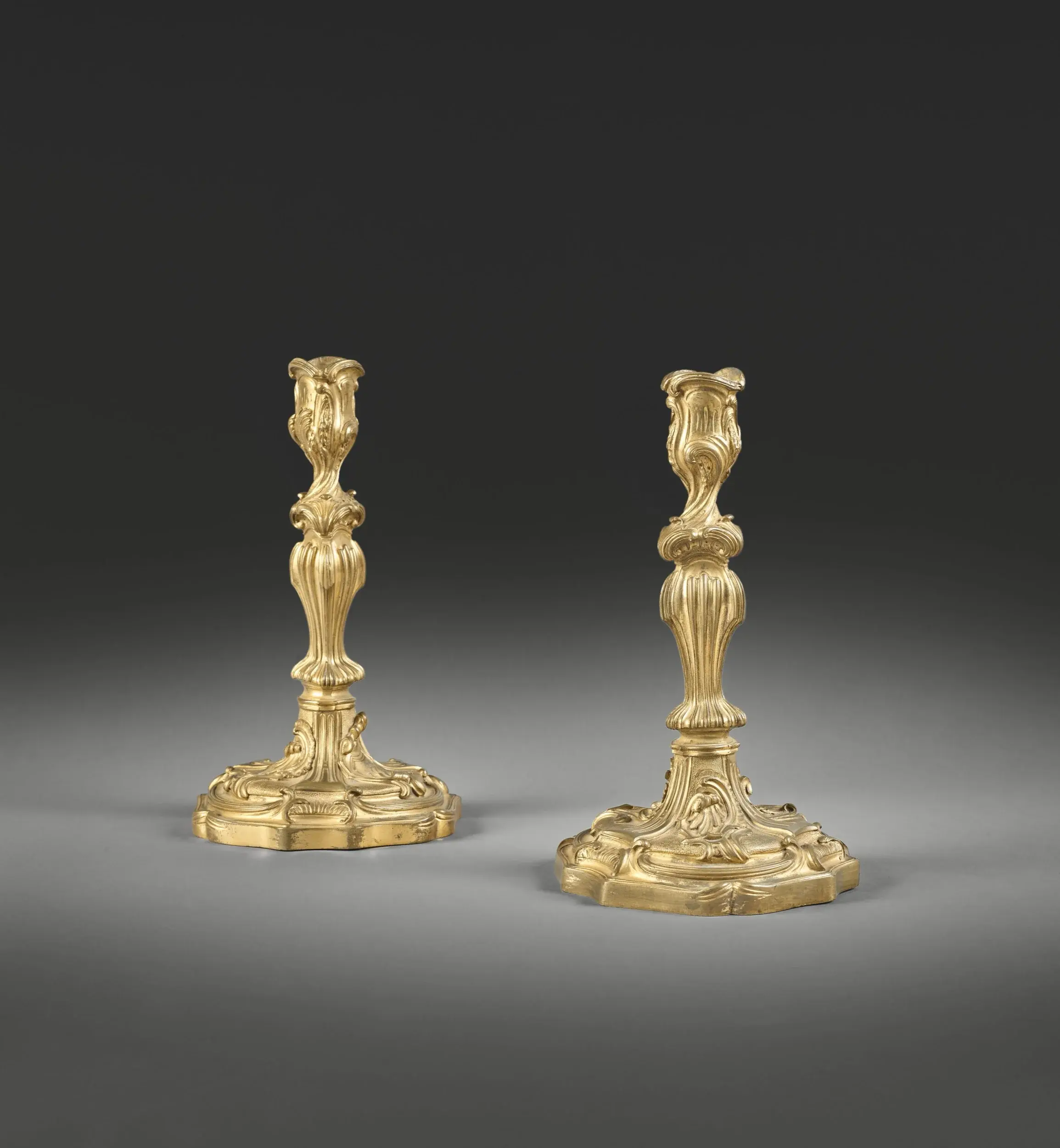 Les flambeaux en bronze doré prolifèrent au cours des premières décennies du XVIIIe siècle. Destinés à être utilisés par paire sur des cheminées, des tables, des bureaux, des commodes, etc ; leurs formes destinées à être vues sous différents angles sont le véhicule idéal des expérience rocailles aux formes tournoyantes animées par des courbes asymétriques ainsi que des ornements dérivés du monde végétal et marin. Rinceaux et palmettes s’étirent gracieusement le long des surfaces, ils tourbillonnent autour de silhouettes peuplées de coquilles et de fleurs dans un mouvement gracieux et serein très éloigné du fourmillement rococo que l’on associe trop rapidement au rocaille.