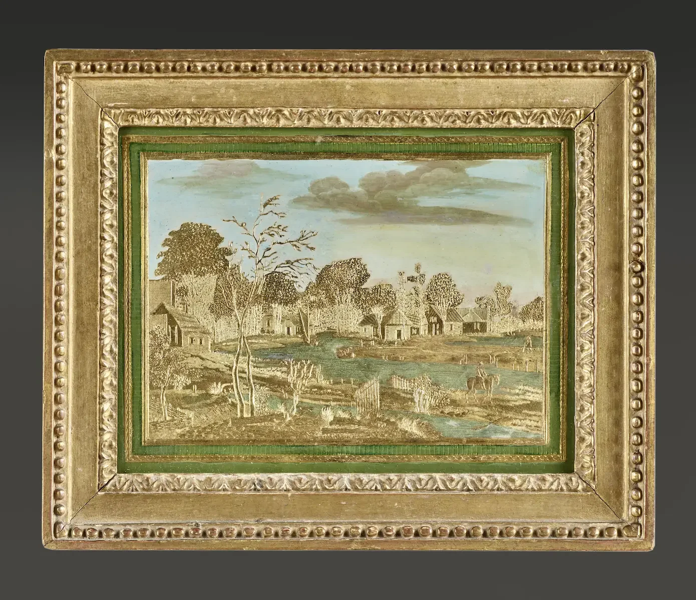 Cette paire de tableaux en Compigné représente deux paysages de bord de rivière, animés de personnages naviguant sur l’eau. De forme rectangulaire, chacun est réalisé sur une feuille d’étain estampée. Cette dernière est rehaussée d’argent, de feuille d’or et de gouache. Ce savant mélange de matières produit un effet de parfaite union entre la peinture et la gravure. Dans le premier tableau, la scène représente, au premier plan, la berge sinueuse d’une rivière. Un premier personnage, debout et vu de dos, contemple le cours d’eau qui s’étire jusqu’à l’arrière-plan. Les lignes horizontales aux teintes argentées, utilisées pour représenter la rivière, évoquent une eau plane et paisible. Deux hommes s’affairent à accoster leur embarcation. Sur la rive opposée, sur la gauche, un hameau se détache, tandis que deux voiliers paraissent au loin. Un second hameau, semblable au premier, surgit au travers d’une végétation clairsemée. Le deuxième tableau propose une scène analogue. Trois étendues d’eau calmes et paisibles, entrecoupées de berges sinueuses, structurent l’espace. Sur l’une d’elles, un cavalier traverse la scène à cheval. Sur une autre, un personnage de dos longe la rive. À l’arrière-plan, un hameau s’élève au cœur d’une végétation luxuriante. Un voilier et une embarcation, accostés le long des berges, complètent la scène. Des rehauts d’or, aux tonalités variées, soulignent certains détails et créent des effets de contraste et d’ombre, conférant un délicat relief et un subtil chatoiement à l’ensemble. Les ciels, traités à la gouache dans des nuances de rose bleuté, traduisent les couleurs douces d’une fin de journée. Cette gamme chromatique passe avec harmonie du rose au gris soutenu des nuages et des oiseaux survolant la scène. Chaque tableau s’inscrit dans un cadre décoré de liserés d’or, d’une frise de perles et de feuilles d’eau.